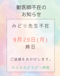 9月29日(月)はみどり先生は不在です。佐藤先生のみの診察となりますので、みどり先生の診察希望の方は30日以降のご来院お待ちしております。