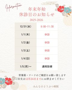 常用薬・処方食の注文は12月24日までによろしくおねがしいます。