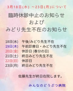 3月18日(水)午後から3月23日(月)みどり先生は不在です。